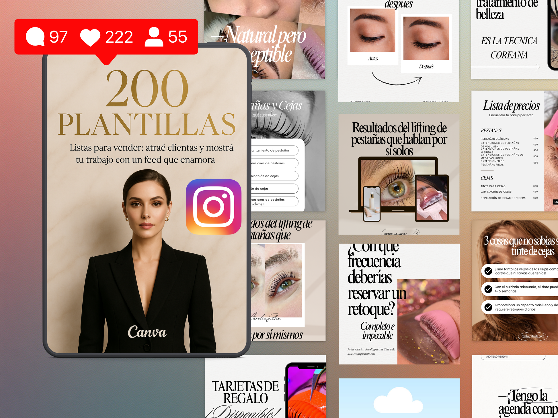 Vas a obtener mas de 200 plantillas editables profesionales para crear contenido estético, estratégico y que convierta espectadoras en clientas fieles.